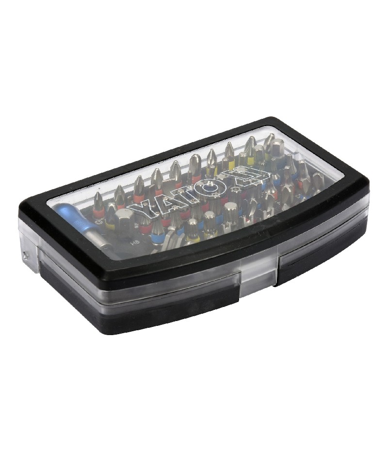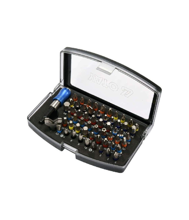 Επαγγελματικό σετ μύτες κατσαβιδιού YATO, σχεδιασμένο για σύσφιξη και χαλάρωση βιδών σε δυσπρόσιτα σημεία. Περιέχουν λειτουργικές μύτες από ανοξείδωτο χάλυβα AISI S2 και έναν προσαρμογέα. Σε θήκη με ευανάγνωστα σημάδια στοιχείων.